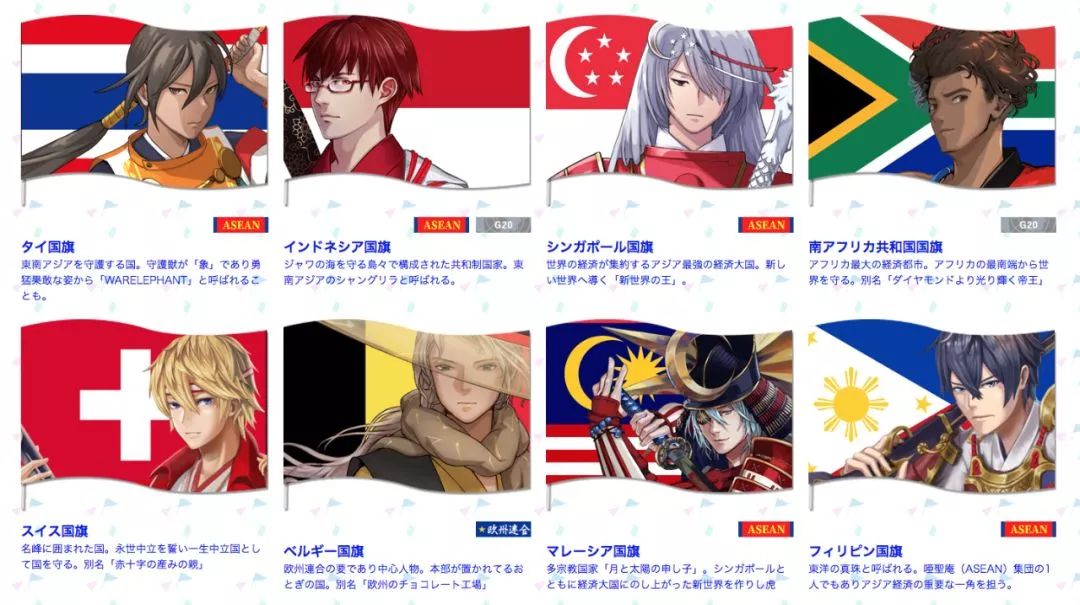 这些动漫形象均以每个的国旗为蓝本进行创作。目前,在world-flags.org网站上已经列出了部分的动漫形象,还有一些的形象正在逐步创作中。